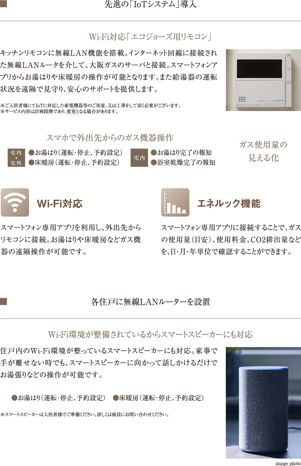 ※「ガス音声リモコン」スキル、「ガスリモコンアプリ」を利用するには、お使いのガス機器に対応するスマートフォンアプリ(給湯器アプリ等)が必要です。※床暖房をお使いのお客さまは、ガス機器に対応するスマートフォンアプリで床暖房名称の設定が必要です。※お湯はりおよび床暖房の温度設定変更・予約はできません。※連携デバイスから操作する場合、操作がガス機器に反映されるまで時間がかかる場合があります。※発話例はスマートスピーカーによって異なります。※ネットワーク環境が不安定な場合、給湯器のエラーを検知できない場合があります。※給湯器のエラーを検知した際にご連絡させていただく電話番号は大阪ガスのエネルギー契約等の際にご登録いただいている電話番号となります。ご登録いただいていない場合はご連絡できません。※給湯器のエラーを検知した際にお電話させていただく時間帯等についてはご指定いただくことはできません。※ご不在等で不通の場合でも日時を変えて複数回お電話させていただきます。以降は修理が必要な際にお客さまからご連絡いただく必要があります。※設置登録手続きの期間中は、対応できない場合があります。※1.プッシュ通知を受け取るには、スマートフォン設定で通知の受け取りを許可してください。※2.連携可能デバイス・Amazon Alexa 搭載デバイス(Amazon Echo シリーズ など)※2.スマートスピーカーは入居者様でご準備ください。詳しくは係員にお問い合わせください。※3.マイ大阪ガスの会員登録が必要です。